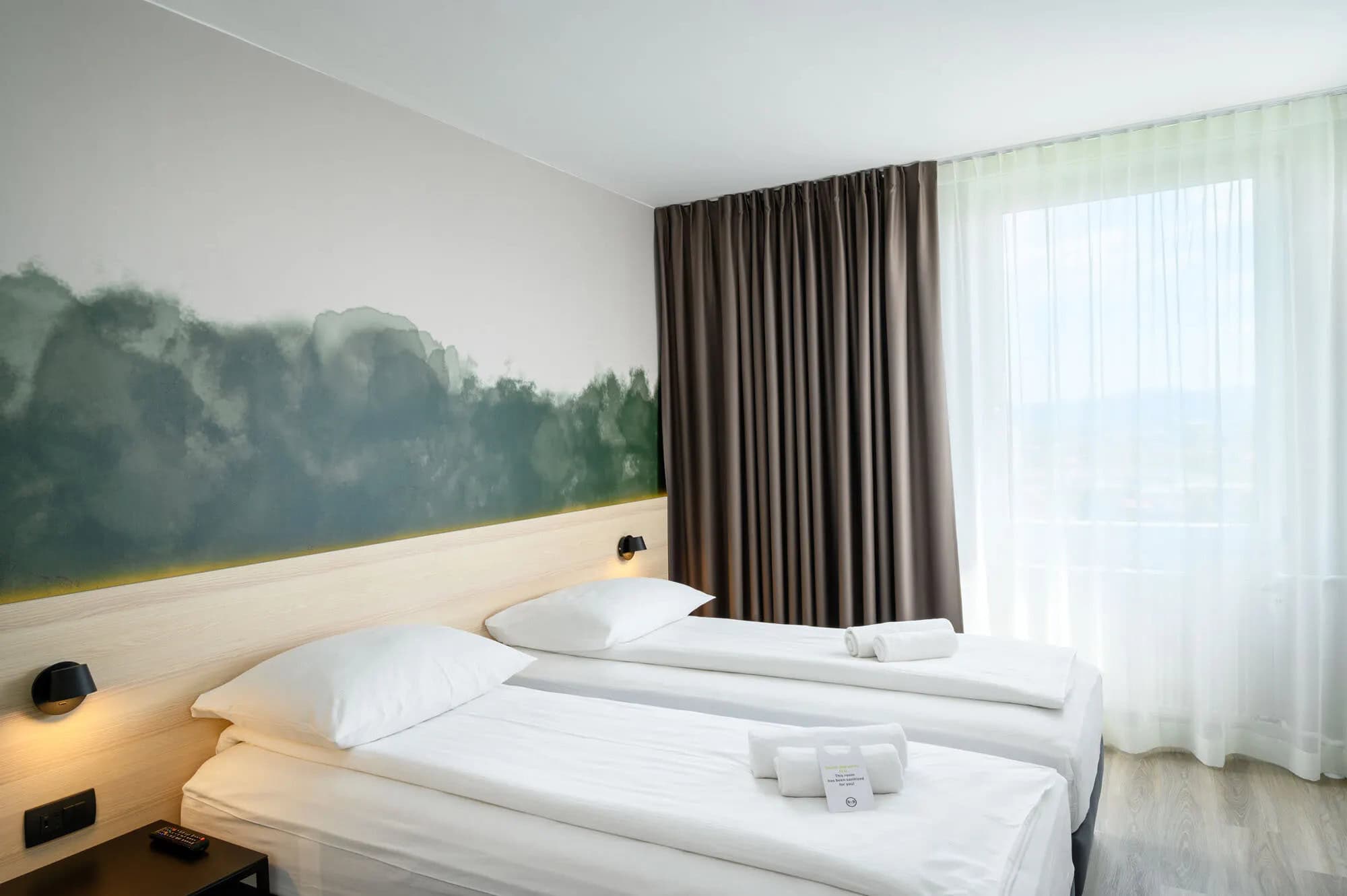 A modern 3-star hotel with comfortable, well-designed rooms, a relaxed urban atmosphere, and a rooftop bar with views over the city, located approximately 10 minutes on foot from the venue.